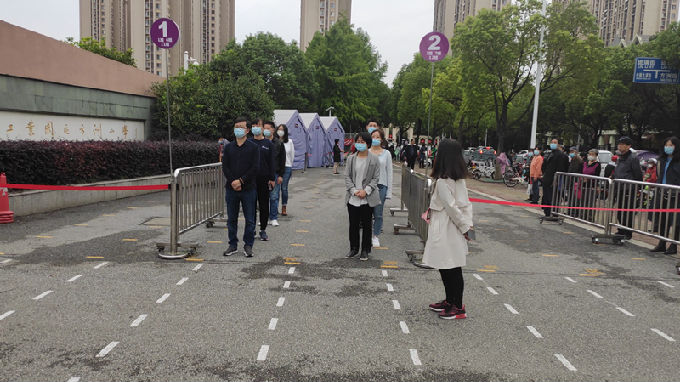 Teachers simulate the students to enter and leave the campus at a distance of one meter.