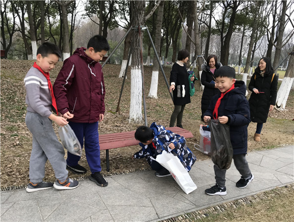 小队员在校外辅导员陈乐烔妈妈、顾清涵妈妈的带领下一大早就到方洲公园开展“乐享环保醉公益”活动。