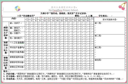 方洲小学的“劳动教育月”设计精巧,以《 “我劳动,我收获,我光荣”打卡记录表》为主线串起“劳动三部曲”,重点聚焦“感恩劳动”“热爱劳动”“致敬劳动”三大板块,让我们先睹为快。