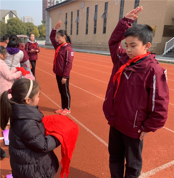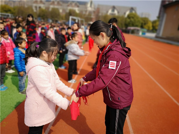仪式唱罢,领巾登场,大队委员们将流动红领巾送给了一年级的弟弟妹妹们,一年级的孩子们渴望早日加入少先队的美好心愿溢于言表。