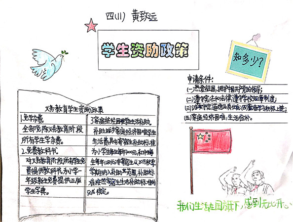 四年级同学们精心制作的小报不仅为大家普及了学生资助政策,还让学生深刻理解到党和国家对贫困学生的关爱。