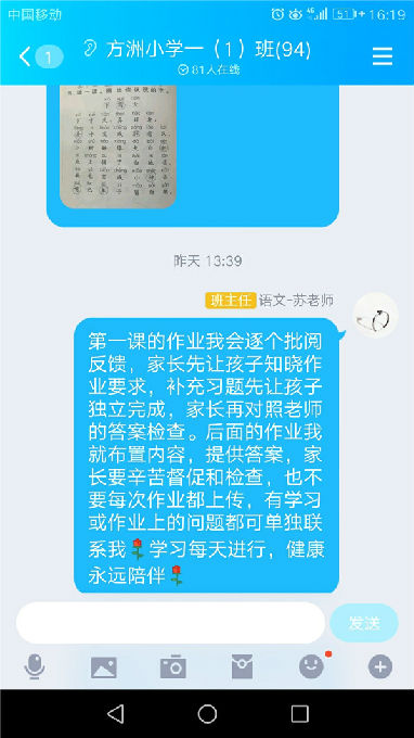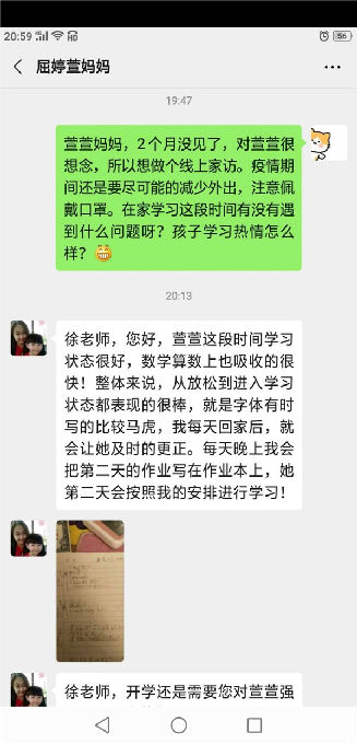 自假期以来,学校教师每天都利用QQ、微信积极与家长进行沟通,了解学生在家学习状态、思想状况、日常锻炼、生活管理等方面的情况,进行指导与评价,达到良好的家校共育效果。