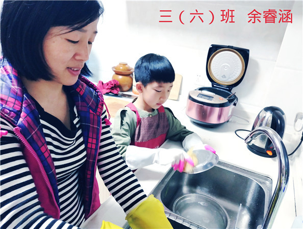 三(2)班周润涛同学说:“我爱劳动,平时在家每天都会做家务,洗衣服、擦鞋子、洗碗,做菜等等。看到自己的劳动成果,真是特别开心!”
