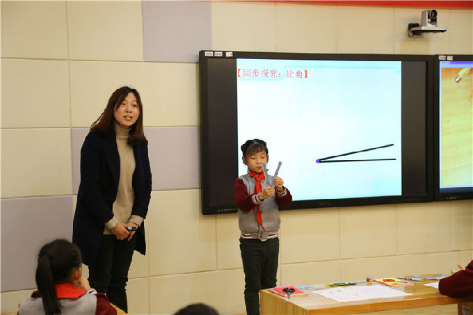 来自新苏师范附属小学的姚佳培老师和园区第三实验小学的成根老师均开设了二年级下册的《认识角》,两个不同场地,打破了空间的隔阂,有着相同的理念,又各有各的精彩。姚老师把知识的传授设计成了一连串精彩的活动:变化较、比角、折角、剪角,让学生理解角的特征,同时通过合作讨论、展示交流等形式,发展了学生的求异思维。成老师从学生熟悉的平面图形中抽象出角,唤醒学生的认知,在比较角的大小环节中,注重指导,反复质疑,逐渐突破难点,正如成老师给人的感觉,他的课堂沉稳、婉约。