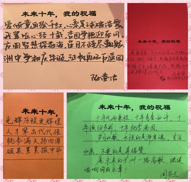老师们满怀对方洲小学未来十年的期许,纷纷拿起笔郑重地写下祝福心愿。一笔一画凝成对学校未来的希望,一顿一扬聚成对学校明天的梦想……