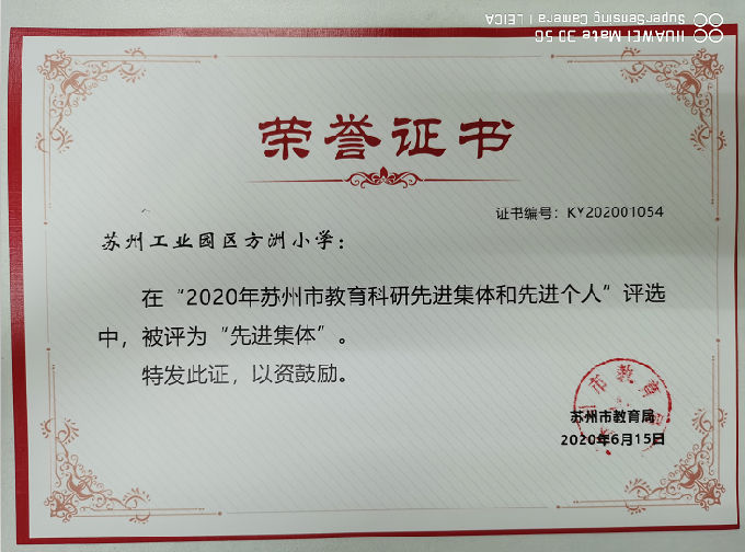 2018年6月由于科研工作突出,学校被认定为苏州市“首批教育科研基地学校”。两年来,方洲小学认真践行“集方圆之慧,筑幸福之洲”的办学理念,积极发挥教育科研“研究、指导、服务、引领”的职能,坚持“服务于学校发展,服务于教育教学改革,服务于教师专业提升”的工作定位,通过多种形式、多个层面的教科研活动,促进学校内涵发展。2019年12月,我校认真整理科研成果,积极申报,经过激烈角逐,2020年6月,学校被评为“苏州市教育科研先进集体”!