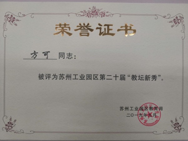 方 可:被评为园区第二十届“教坛新秀”(小学语文)