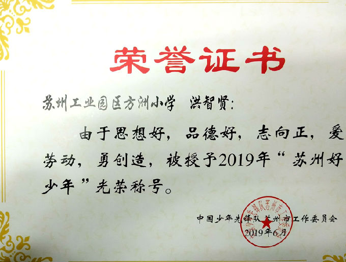 方洲小学3名少先队员荣获“苏州好少年”称号