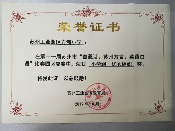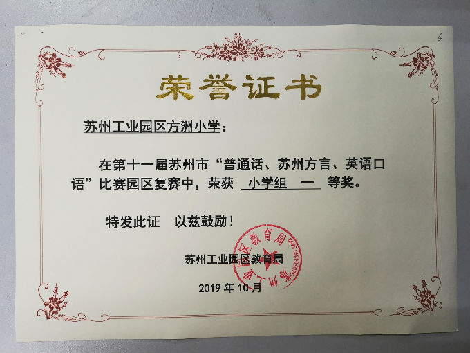 喜报:热烈祝贺方洲小学在苏州市“普通话、苏州方言、英语口语”园区复赛中荣获一等奖、优秀组织奖! 来源: 发布时间:2019-11-18 00:00:00 浏览次数: 次 【字体:小 大】 喜 报 热烈祝贺方洲小学在苏州市“普通话、苏州方言、英语口语”园区复赛中荣获一等奖、优秀组织奖! 分享到: 【打印正文】