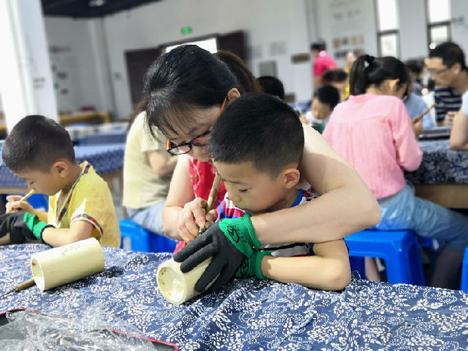 第四天上午,家长和孩子们共同体验了徽派的竹雕。此时的孩子们力气有限,家长们也按捺不住,展开了技能的拼搏,每个人刻得都很认真。作品完成啦!大家看着自己的成果,幸福满满!