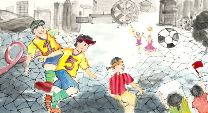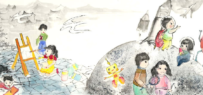 整幅作品以姑苏城和大园区为背景,表现了学生们丰富多彩的校园活动:形式丰富的多彩童画、智趣巧思的科学探究、娓娓动听的昆曲评弹、热火朝天的体育活动……展现了孩子们朝气蓬勃、活力四射的精神面貌。