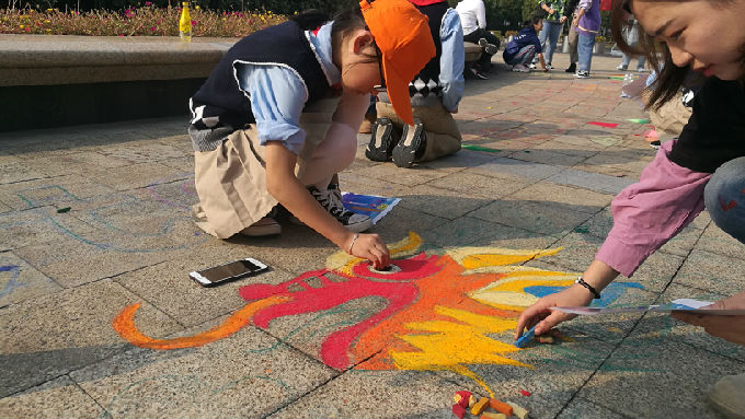 在活动开始前,孩子们先观摩了艺术家现场街画的过程,艺术家们个性洋溢,泼彩挥毫,引得孩子们阵阵惊叹。随后,孩子们跟随现场工作人员的指引,获得了自己涂鸦的一片“领地”,在耐心听了艺术家指导后,孩子们迫不及待地开始了街画涂鸦。不一会儿功夫,原本苍白的地面立刻变得绚丽多彩。孩子们沉醉在秋风送来的阵阵桂花香气中,一幅幅精彩画卷渐渐成型。