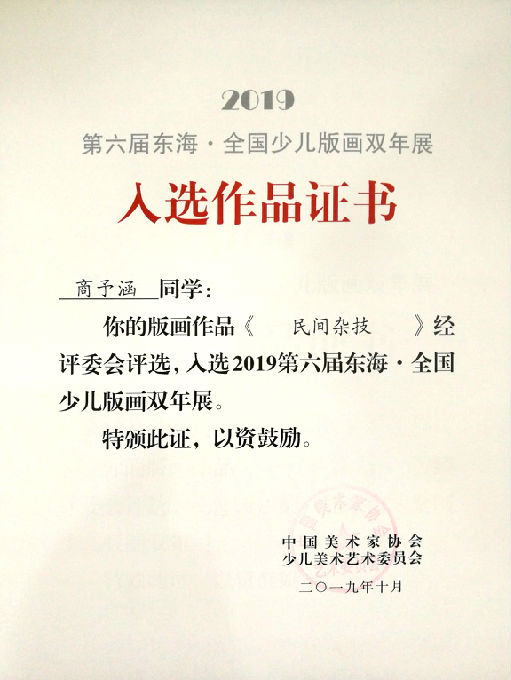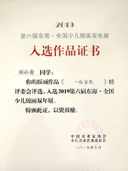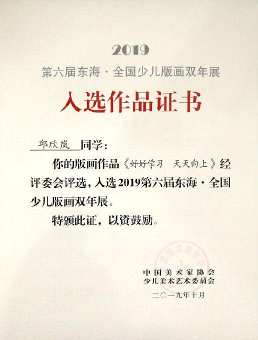 近日,由中国美术家协会少儿艺委会和东海县人民政府联合主办的2019第六届东海·全国少儿版画双年展在东海隆重开幕。我校版画社团3位学生作品入选,分别是商予涵、顾孙裔(已毕业)、邱欣岚(已毕业),学校荣获“优秀组织奖”,习惠老师获“优秀指导教师”。