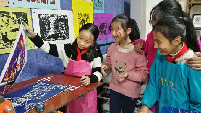 方洲小学版画工作室成立于2012年,自成立以来,经过了不断探索尝试,从吹塑纸版画到纸版、橡胶板,再到木版画。通过多种媒材的运用,提高了学生对各种绘画材料的驾驭能力和动手能力。