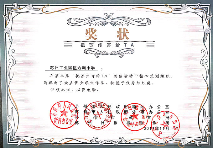 在苏州市人民政府新闻办公室、苏州市教育局宣传与信息处等联合举办的第三届“把苏州寄给TA”中小学生画信活动中,方洲小学多名师生获奖,学校被评为“优秀组织奖”。其中,印张丹等同学荣获金奖,高王楉珺、梁缘、王秭月等多名同学获银奖,多名老师获“优秀辅导奖”。