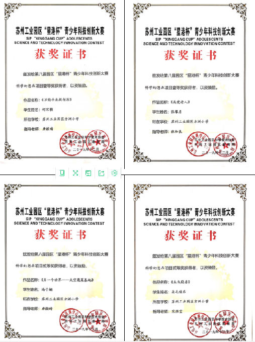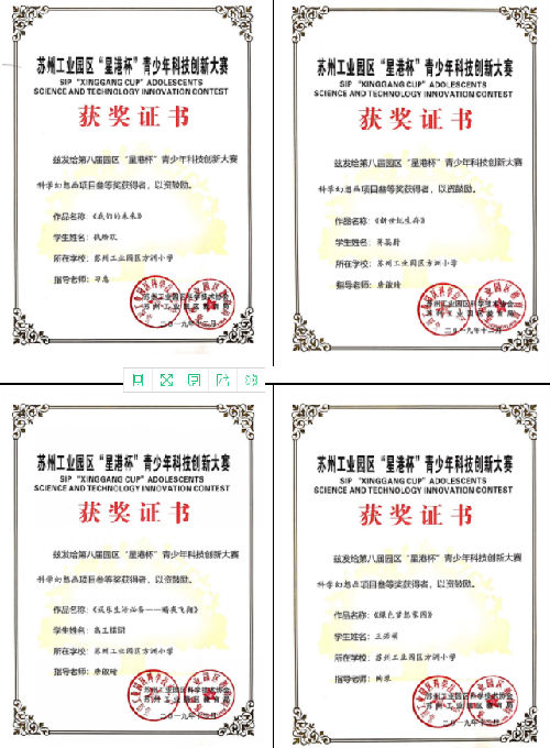 在苏州市工业园区教育局等举办的第八届“星港杯”青少年科技创新大赛科学幻想画中,何宋棪、张馨月等同学荣获一等奖,冯子娴、吴毛佳乐、钱绘苁、蒋蕊蔚、高王楉珺、王若萌等多名同学获二、三等奖,多名老师获“优秀辅导奖”。