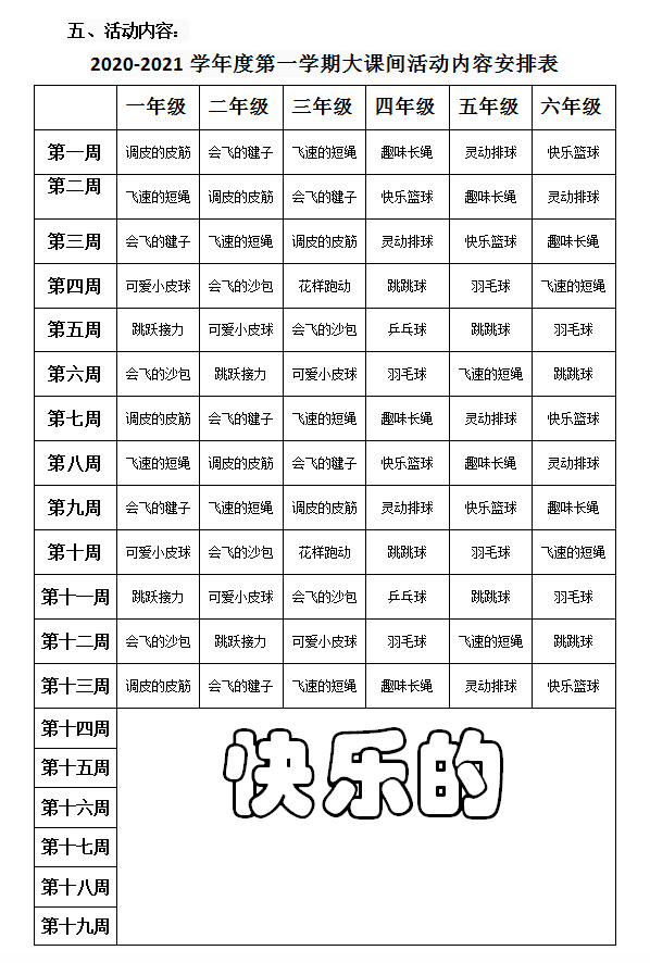 3.学校每周三、五大课间活动时间先完成广播操《希望风帆》,然后按照大课间活动安排表进行活动。
