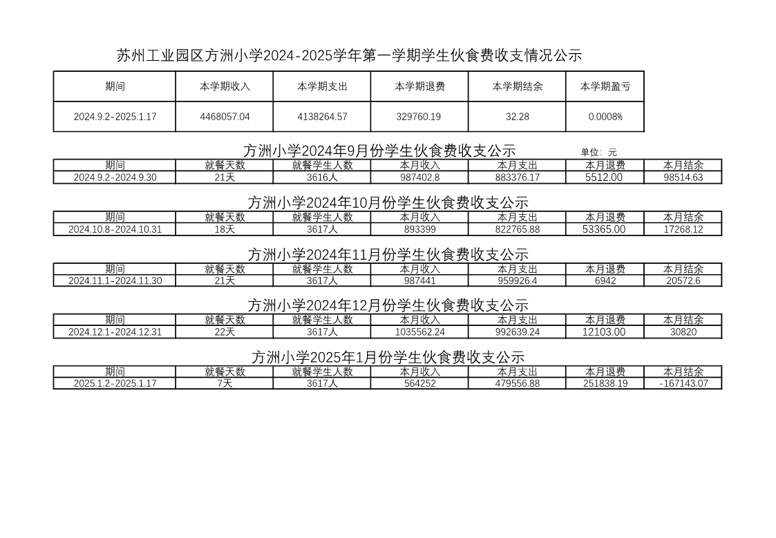 苏州工业园区方洲小学2024-2025学年第一学期学生伙食费收支情况公示 来源: 发布时间:2025-02-12 09:17:09 浏览次数: 次 【字体:小 大】 终审:fzwz 分享到: 【打印正文】