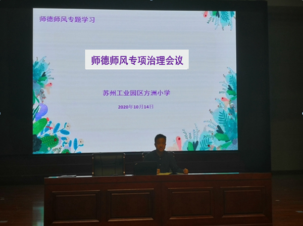 为全面贯彻落实苏州工业园区教育局《关于开展中小学师德师风突出问题持续专项治理工作的通知》要求,切实加强学校师德师风建设,提高教师教书育人、为人师表的良好形象。近日,苏州工业园区方洲小学全体教师齐聚方圆剧场,召开了师德师风专项治理会议。