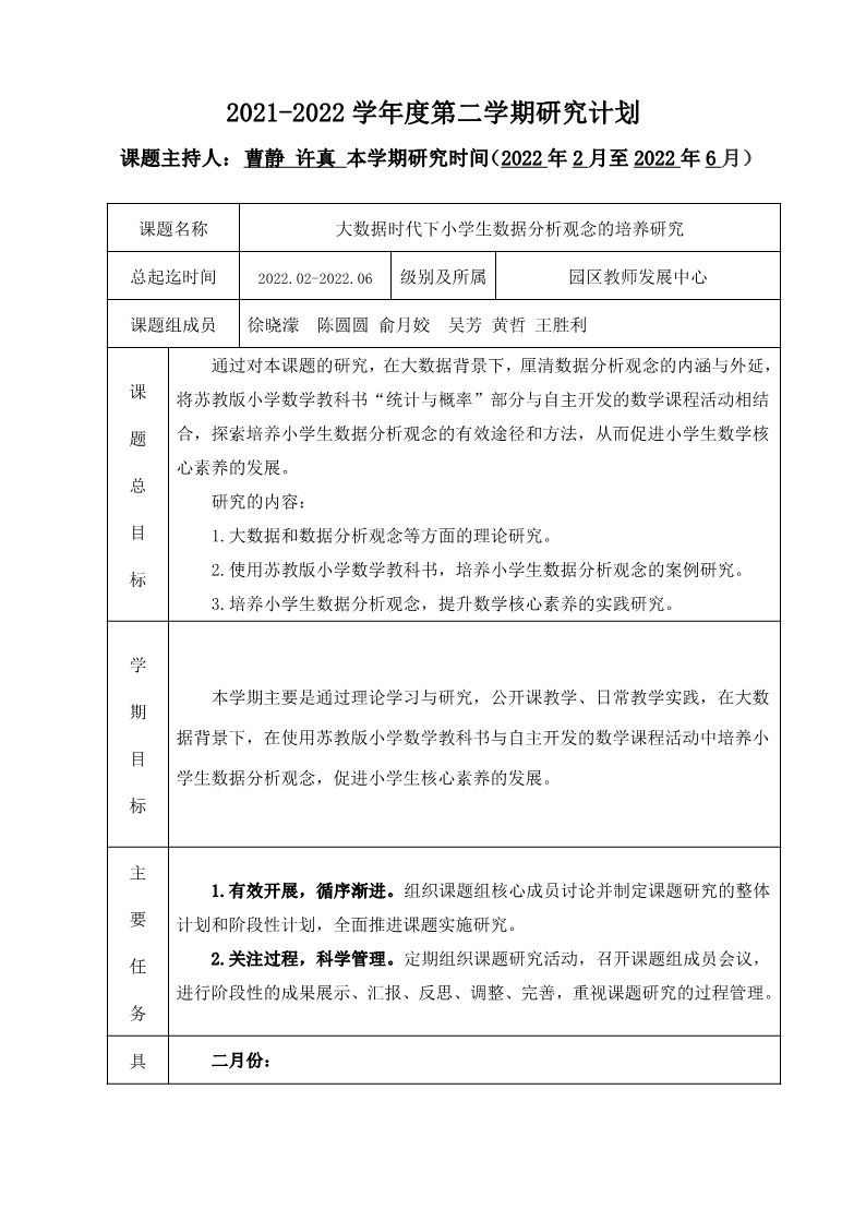 2021-2022学年度第二学期研究计划( 大数据时代下小学生数据分析观念的培养研究) 来源: 发布时间:2022-11-17 19:37:30 浏览次数: 次 【字体:小 大】 终审:fzwz 分享到: 【打印正文】