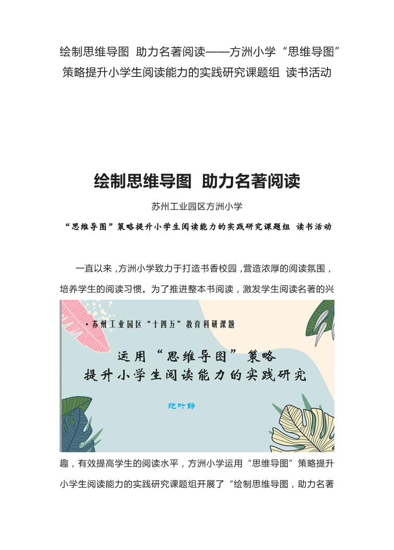 绘制思维导图 助力名著阅读——方洲小学“思维导图”策略提升小学生阅读能力的实践研究课题组读书活动 来源: 发布时间:2022-11-17 17:16:22 浏览次数: 次 【字体:小 大】 终审:fzwz 分享到: 【打印正文】