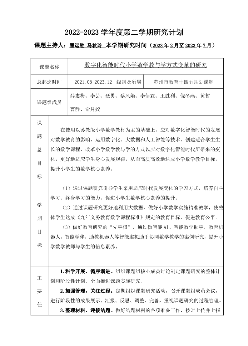 “数字化智能时代小学数学教与学方式变革的研究”2022-2023学年度第二学期研究计划 来源: 发布时间:2023-02-07 12:35:04 浏览次数: 次 【字体:小 大】 终审:fzwz 分享到: 【打印正文】