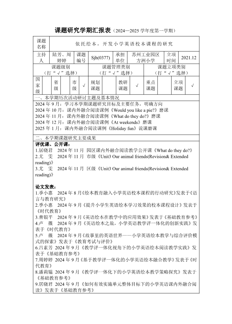课题研究学期汇报表(2024-2025学年度第一学期)